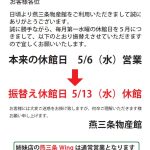 5月休館日振替えのご案内(5/6→5/13) 5月6日の休館日を5月13日に変更いたします。ご不便をおかけいたしますが、何卒ご理解賜りますようお願い申し上げます。