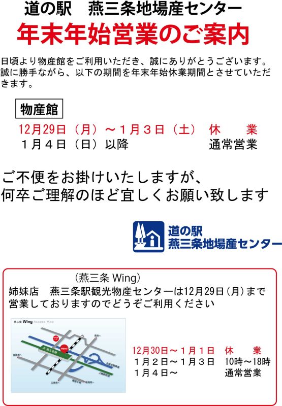 2025年12月29日(月)~2026年1月3日(土) | (燕三条地場産センター物産館) | 一般 | 物産観光・施設課 |