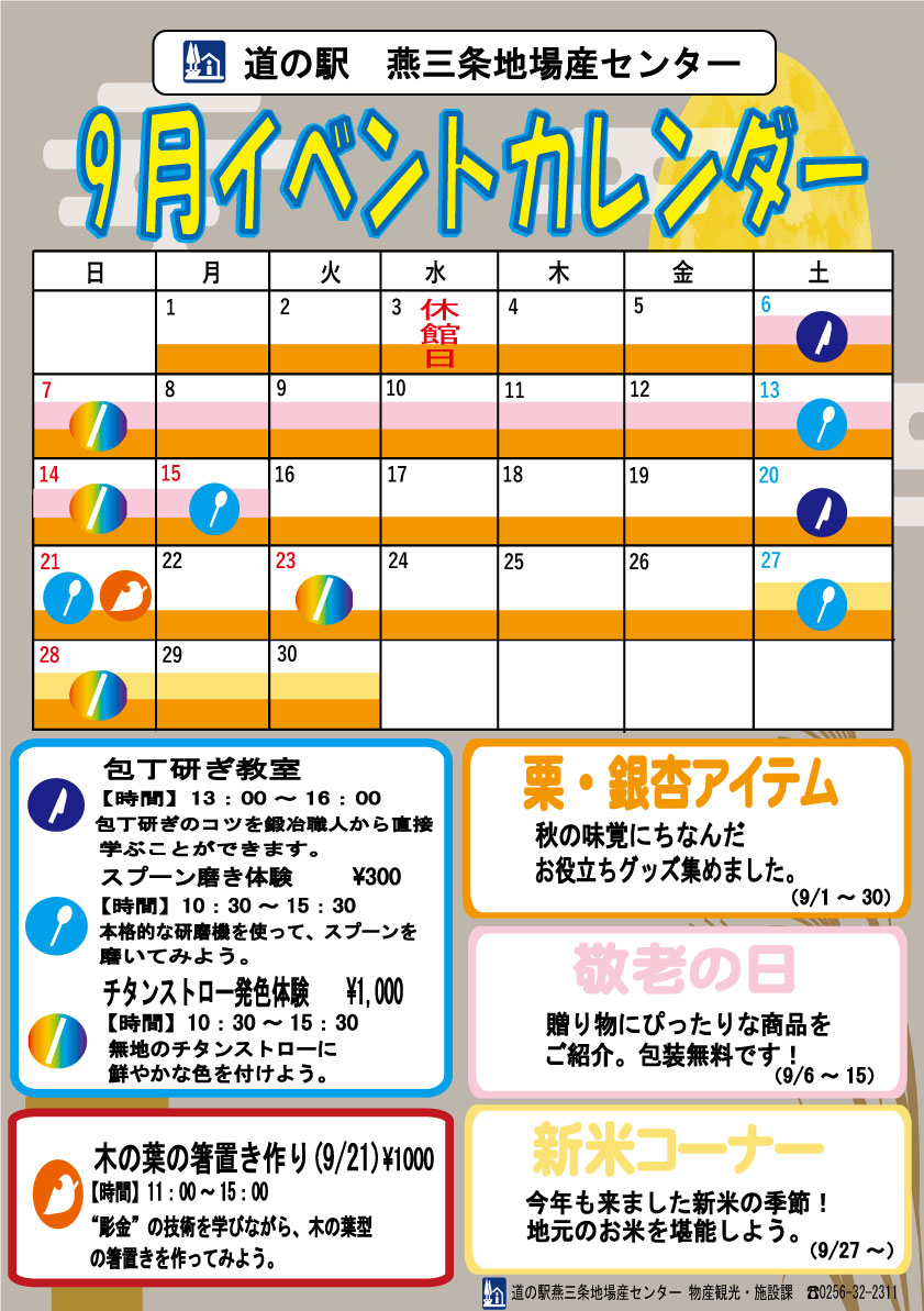 9月1日(月)~9月30日(火) | 9:30~17:30(道の駅 燕三条地場産センター物産館) | 一般 | 物産観光・施設課 |