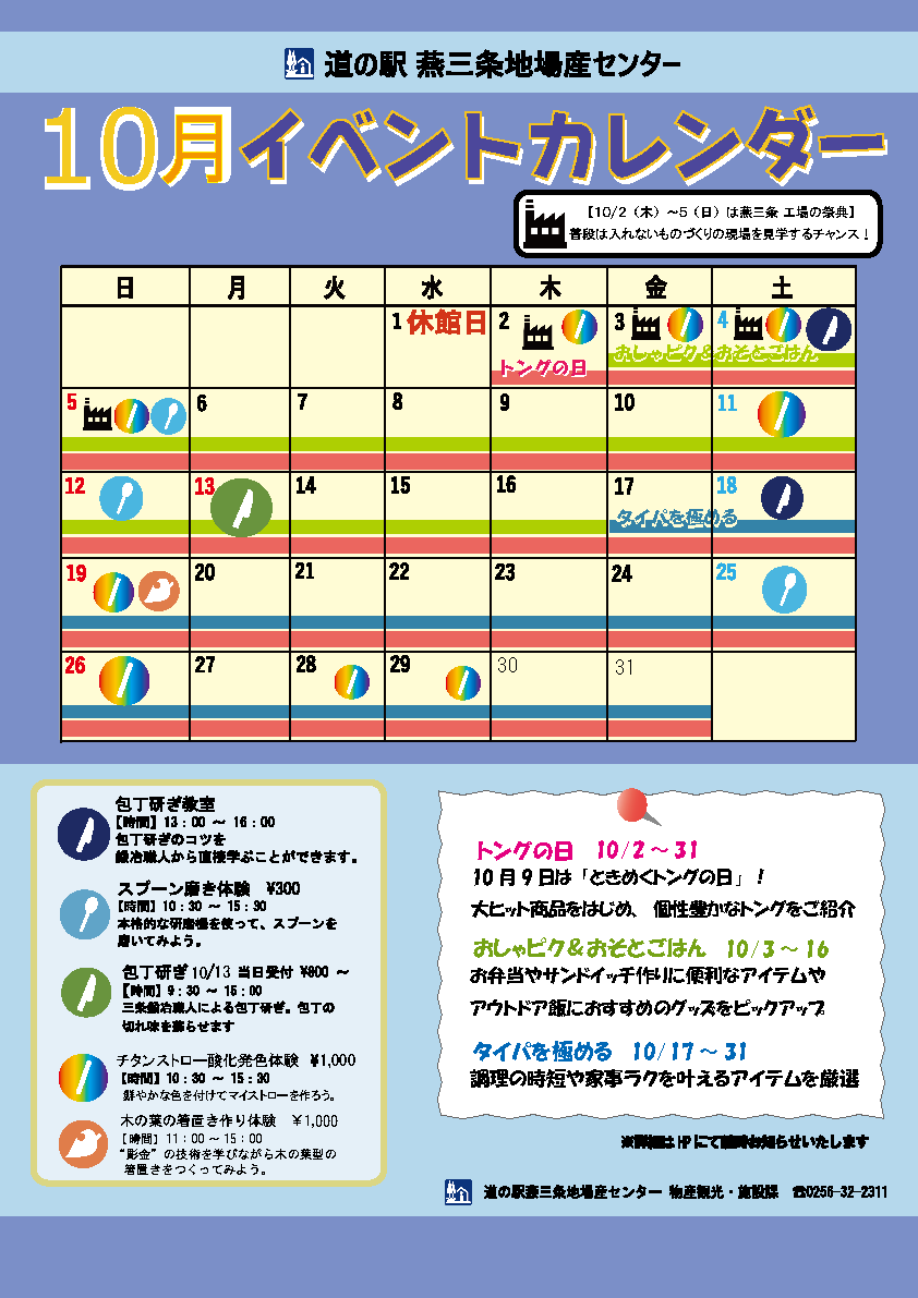10月の物産館イベント情報をご紹介します。 燕三条地域ならではのイベントへぜひお越しください。 イベントカレンダーはこちらをご覧ください。 【問い合わせ先】物産観光・施設課 TEL:0256-32-2311(代)