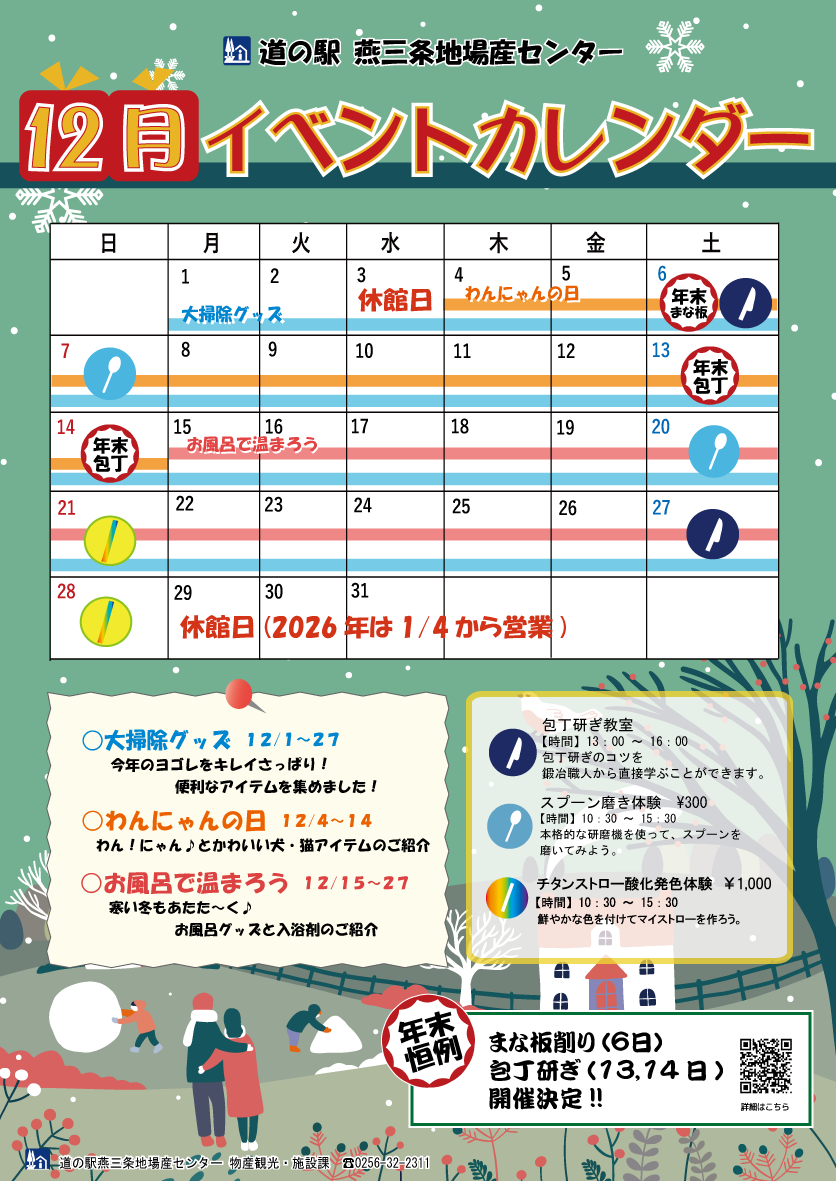 令和7年12月1日(月)~12月31日(水) | 9:30~17:30(道の駅燕三条地場産センター物産館) | 一般 | 物産観光・施設課 |