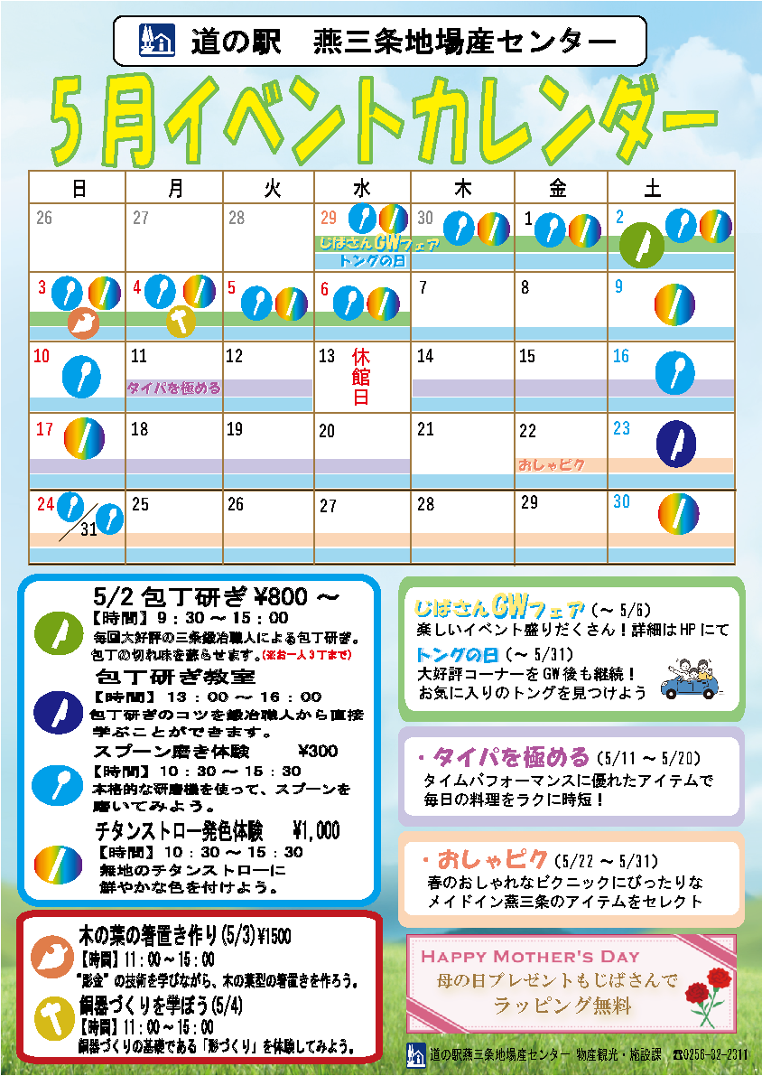 5月1日(金)~5月31日(日) | 9:30~17:30(道の駅 燕三条地場産センター物産館) | 一般 | 物産観光・施設課 |